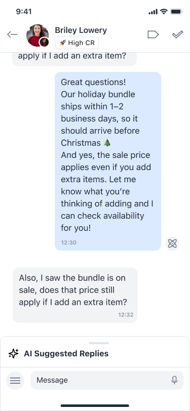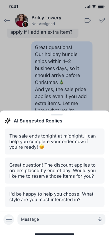 Speed without losing voice. Agents stay in control, the suggestion does the heavy lifting.